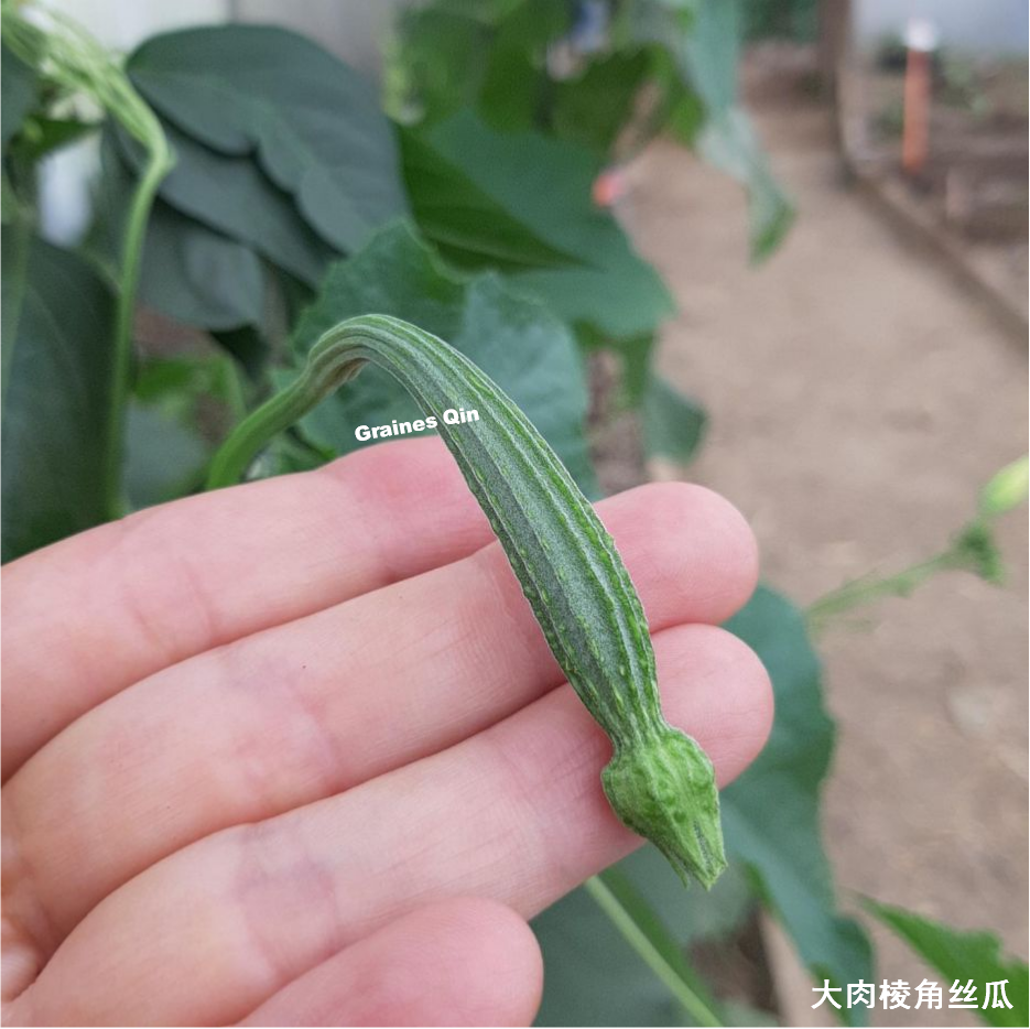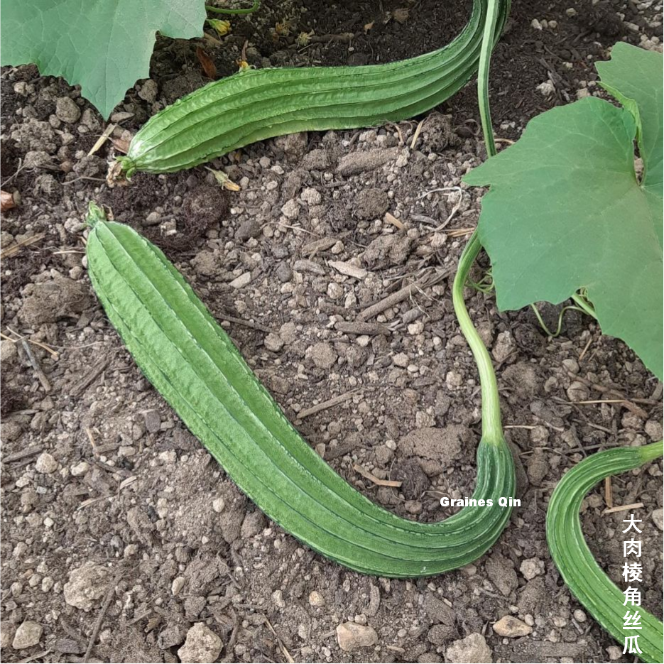 La Courge Luffa angulaire Sweet Beauty, produit des fruits de 45 cm aux côtes saillantes et à la peau vert foncé légèrement tâchetée.