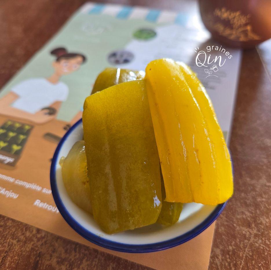 Les fruits atteignent en moyenne 30 cm de longueur pour environ 3,5 cm de diamètre. La chair vert blanchâtre, ferme et dense, présente une texture croquante et une saveur fraîche et douce. Faiblement aqueuse, elle est particulièrement adaptée à la transformation, notamment pour la marinade et les pickles, tout en pouvant être consommée crue ou en salade.